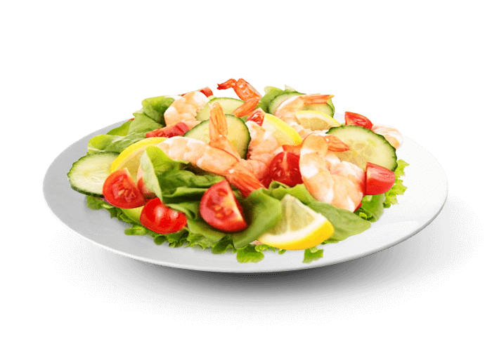 Salade verte, tomates, sauce vinaigrette, crevettes, maïs, concombre.